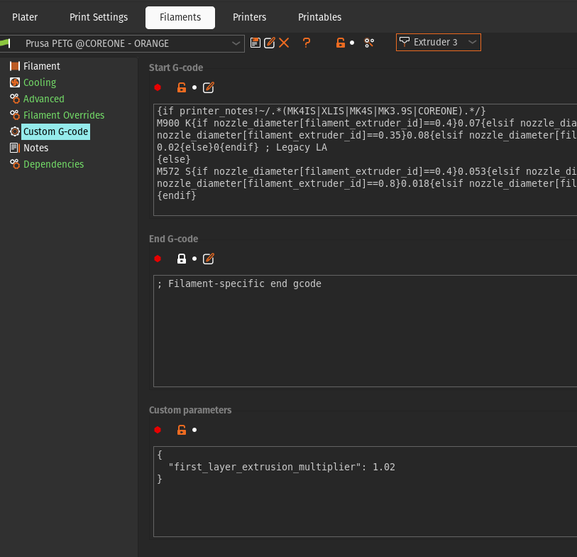Filament profiles have a new Custom parameters option available in the Custom G-code section that accepts JSON and we’re gonna define a new firstLayerExtrusion parameter.