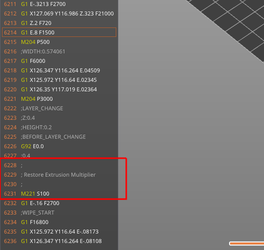 Now jump to the end of the first layer and look for a “Restore Extrusion Multiplier” comment.