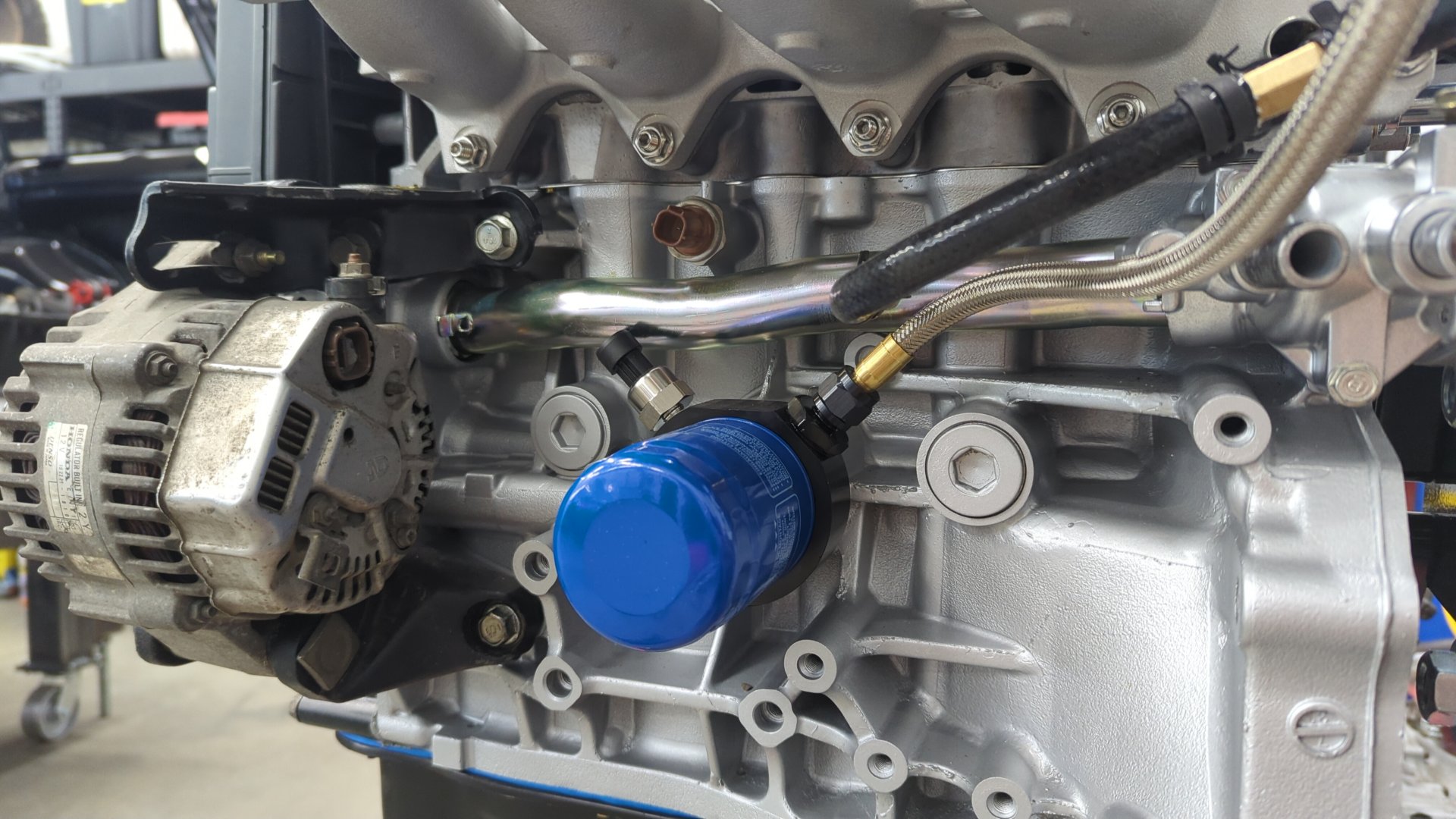 Now’s a good time to wrap up any work on the backside of the block like installing the oil filter sandwich and oil supply line since the engine is basically ready to drop in the car. I had already installed the oil filter sandwich on my block but I had to loosen it up and rotate it counter-clockwise because the oil pressure sender unit for my aftermarket gauge was so close to the water pipe that the connector wouldn’t fit.
