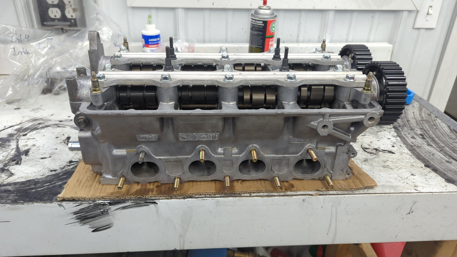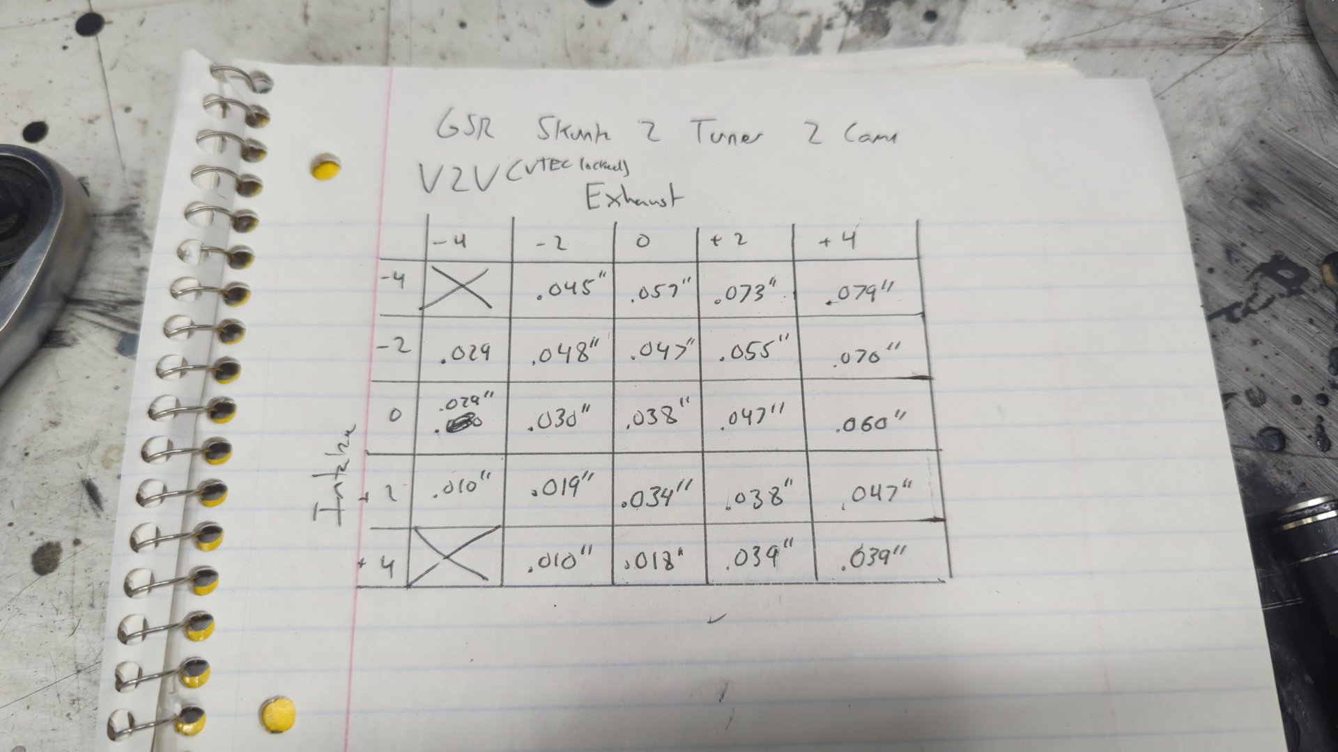 In order to check V2V, both cams must be installed in the head and ideally only 2 valves / rockers (one intake, one exhast) are installed to make turning over the camshafts easier. (less spring force to fight) To make the process even easier you can buy checking springs that are super weak and meant just for measuring but I don’t have any so I used two of the stock exhaust GSR springs as they are soft enough to be manageable.