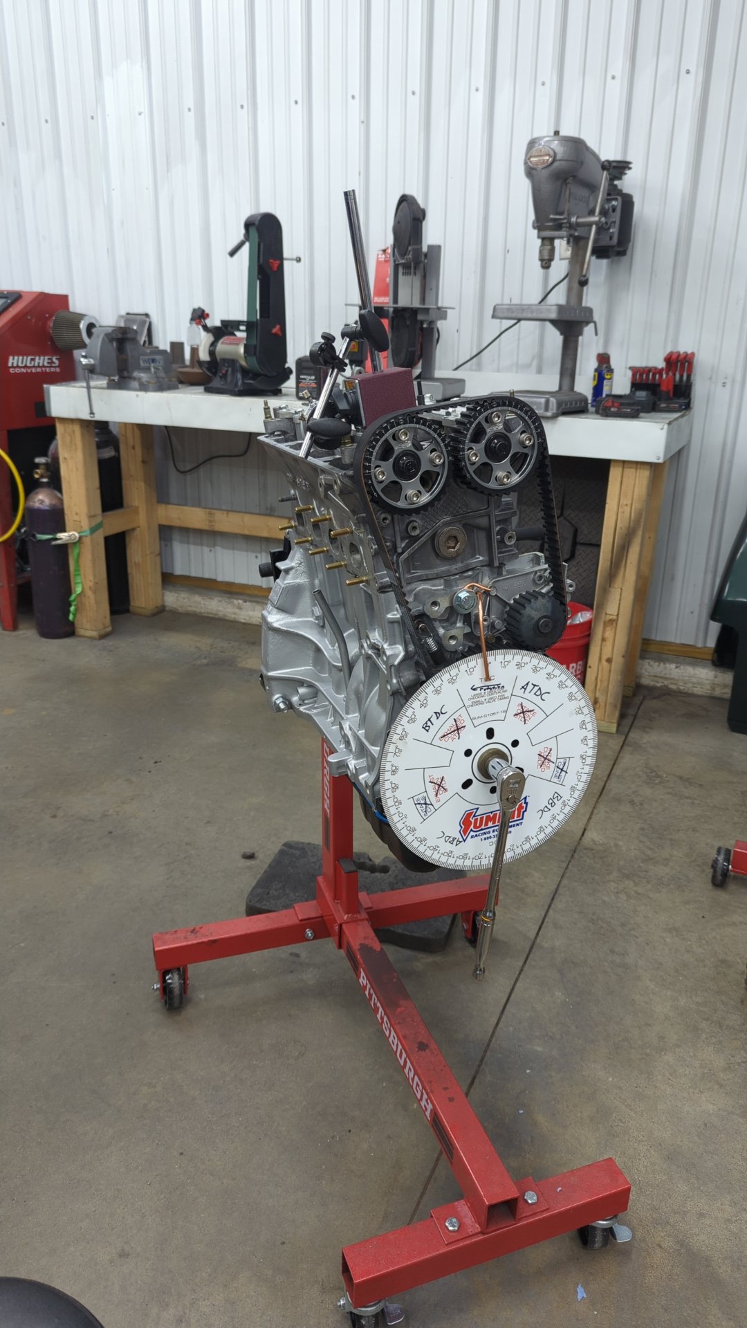 Next up is to check piston to valve clearance but we can’t do that until the cams are degreed. Degreeing the cams is important because it lets us confirm if the cams are aligned with the crank when the crank is at TDC (top dead center) and the cams are at 0 degrees.