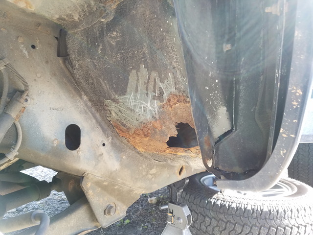 I first noticed this hole when I removed the inner fender liner to replace my dead wiper fluid pumps. I really didn’t expect it to be so large, as just the previous summer I had pulled the carpet and cleaned up the inner floor pan and didn’t spot any rust that was too horrible.