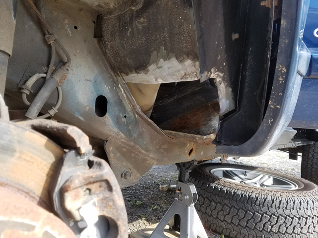 Like a diseased limb, there’s only one way to prevent rust from spreading and that’s by chopping it off. A 4" disc on the grinder made quick work of the thin metal. The only thing that I had to be careful about was the interior wire harness which was only inches away from the hole.