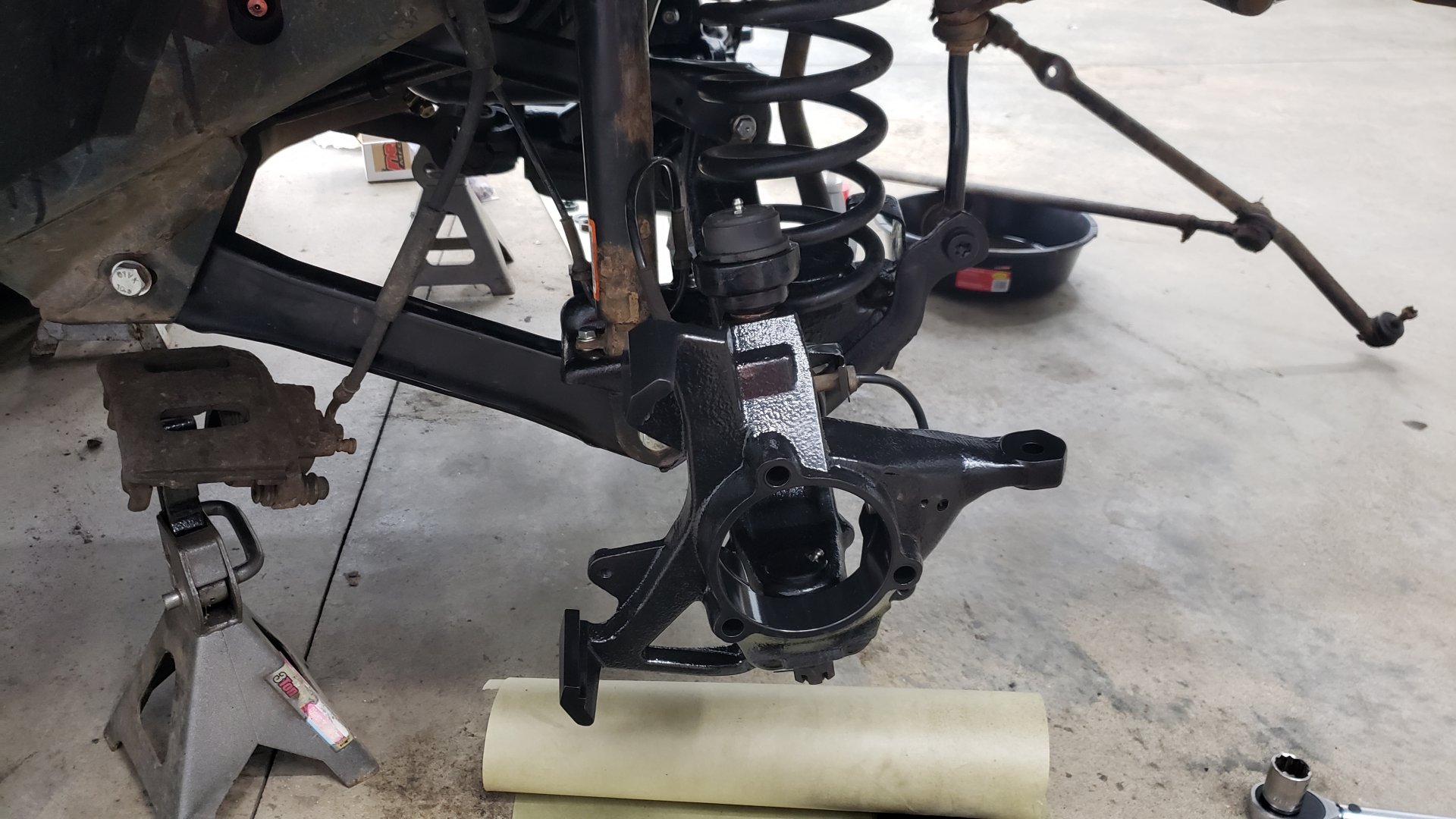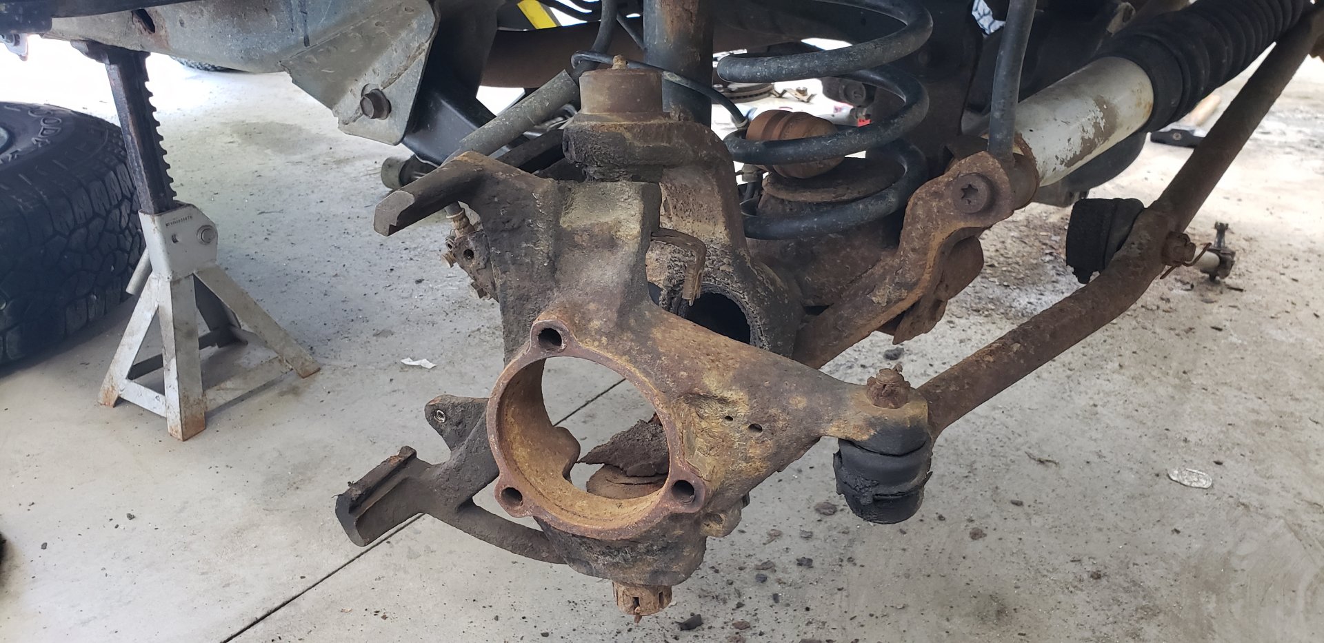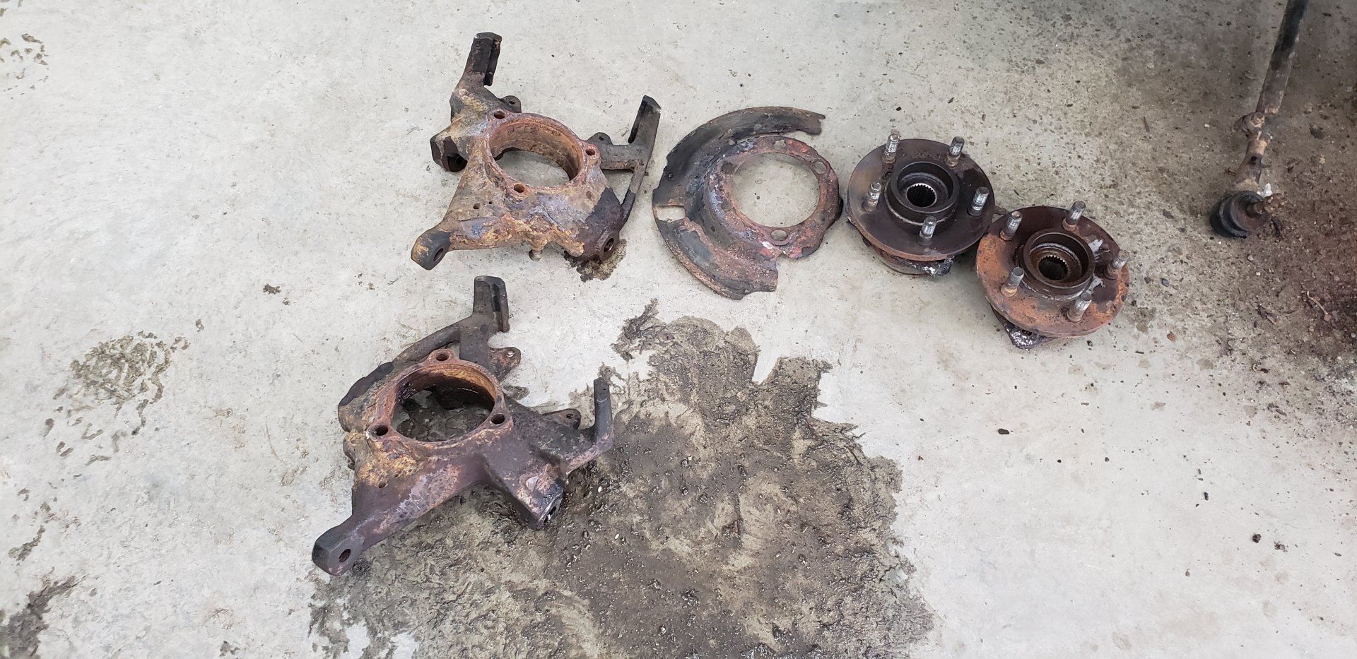 Here’s a shot of the passenger side knuckle after the axle shafts were removed and the wheel bearings had been removed. Both wheel bearings had to have their bolts heated red hot via torch to break them free.