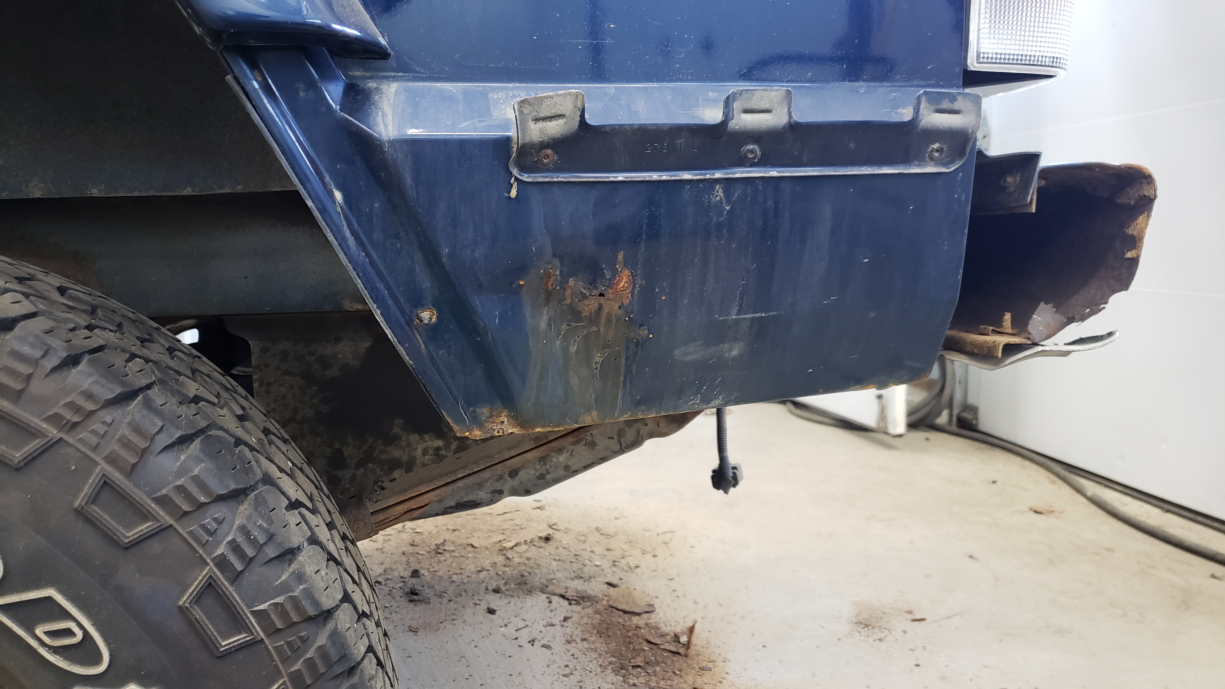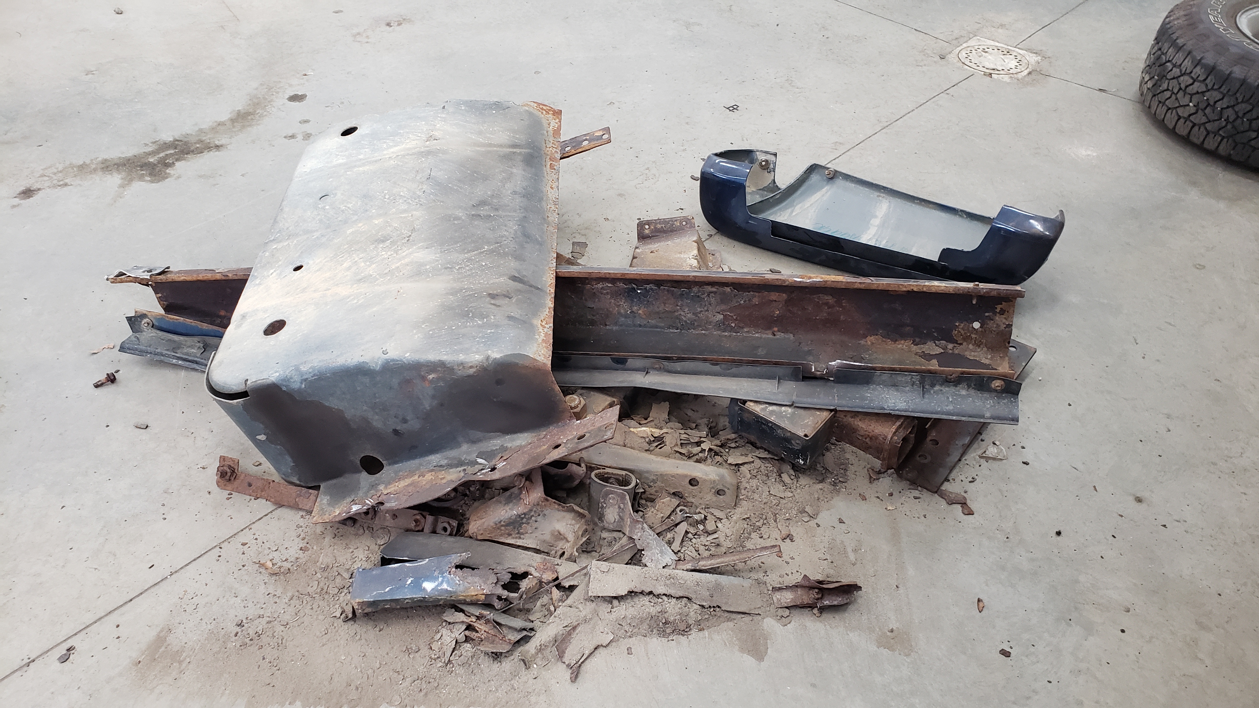 With the hitch out of the way I needed to remove the rear bumper. I ended up ripping off the plastic side pieces of the bumper since all of the screws were so rusted out that the heads would strip if you stared at them too hard.