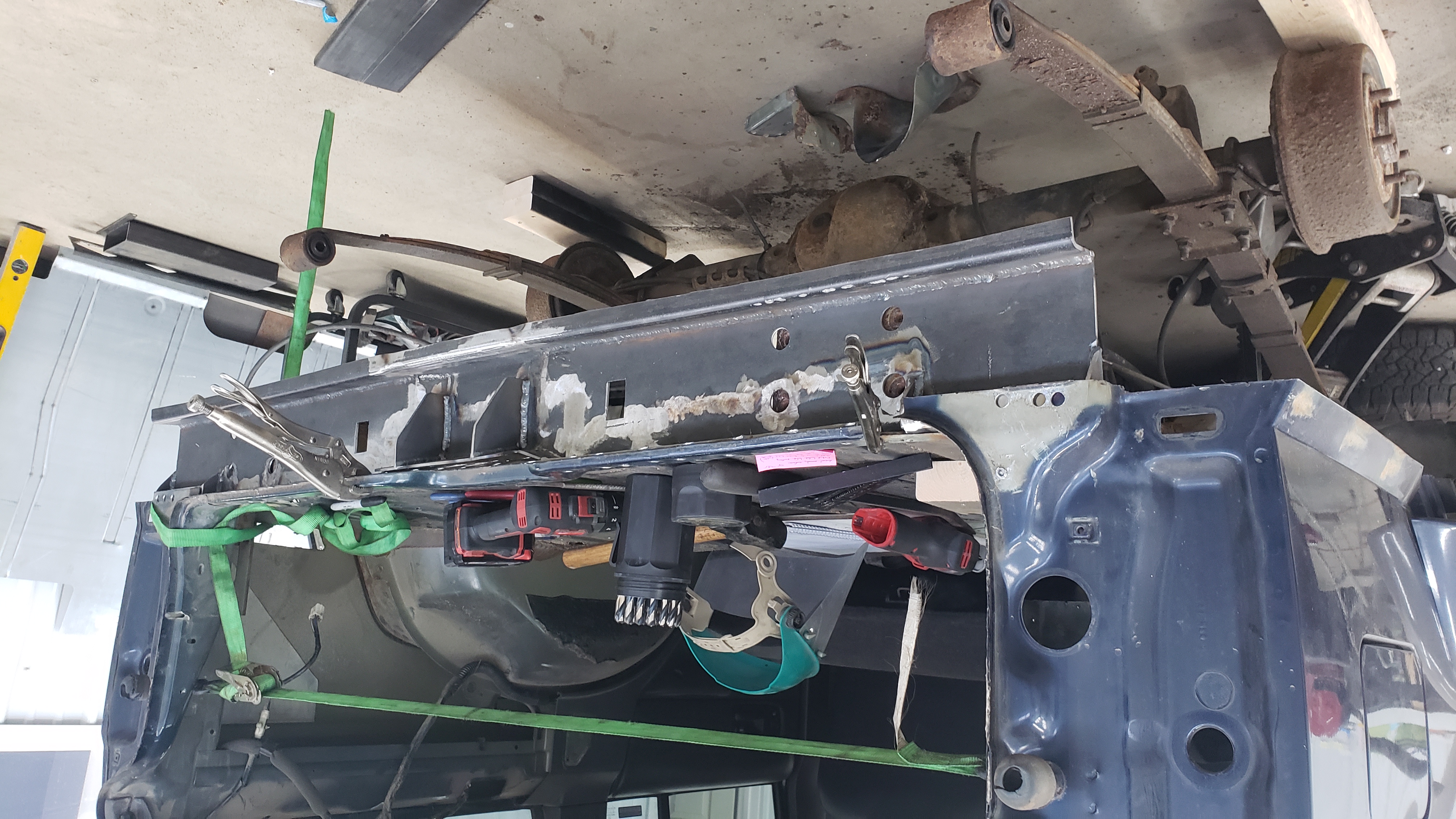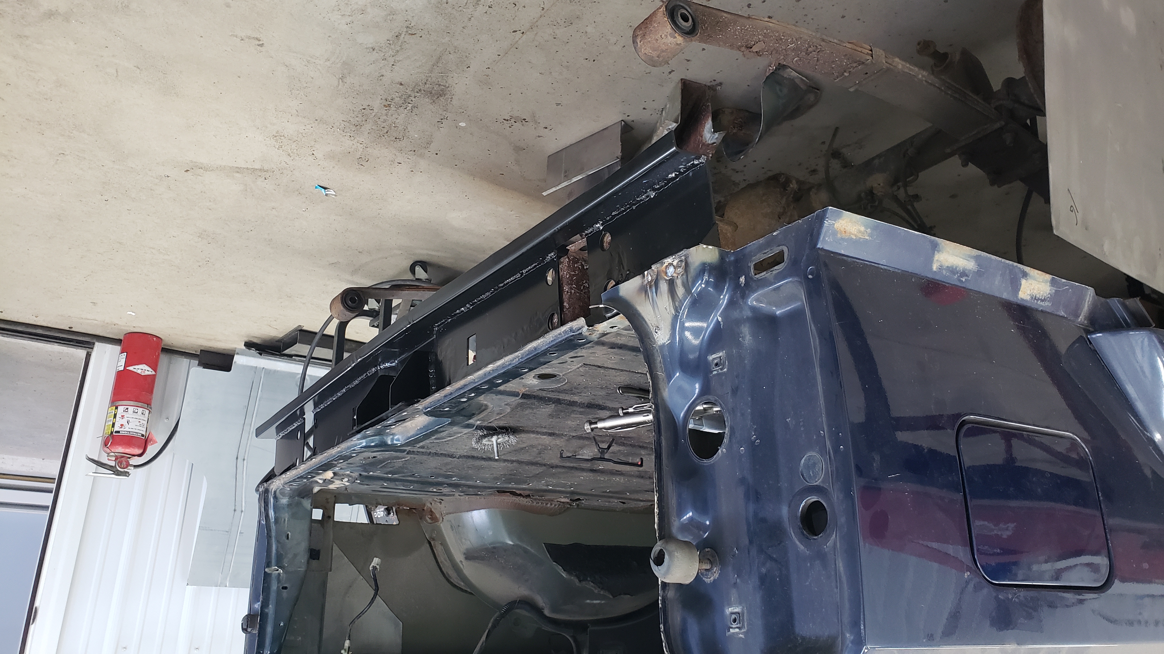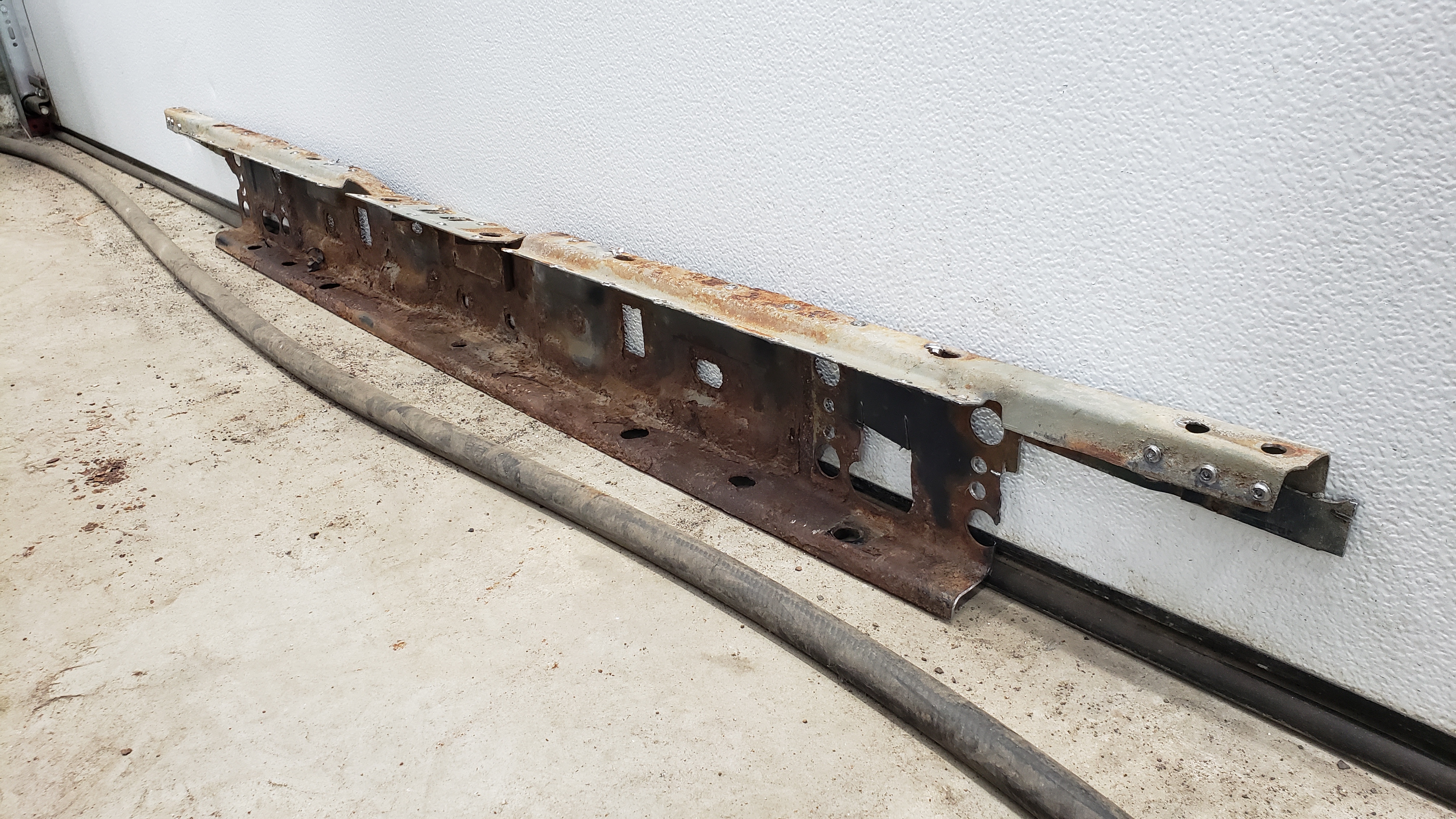 The crossmember removed. It’s missing part of its ends since I had to cut them off to free the crossmember. There’s a couple spot welds behind where the tail lights sit that are impossible to reach with a standard drill.