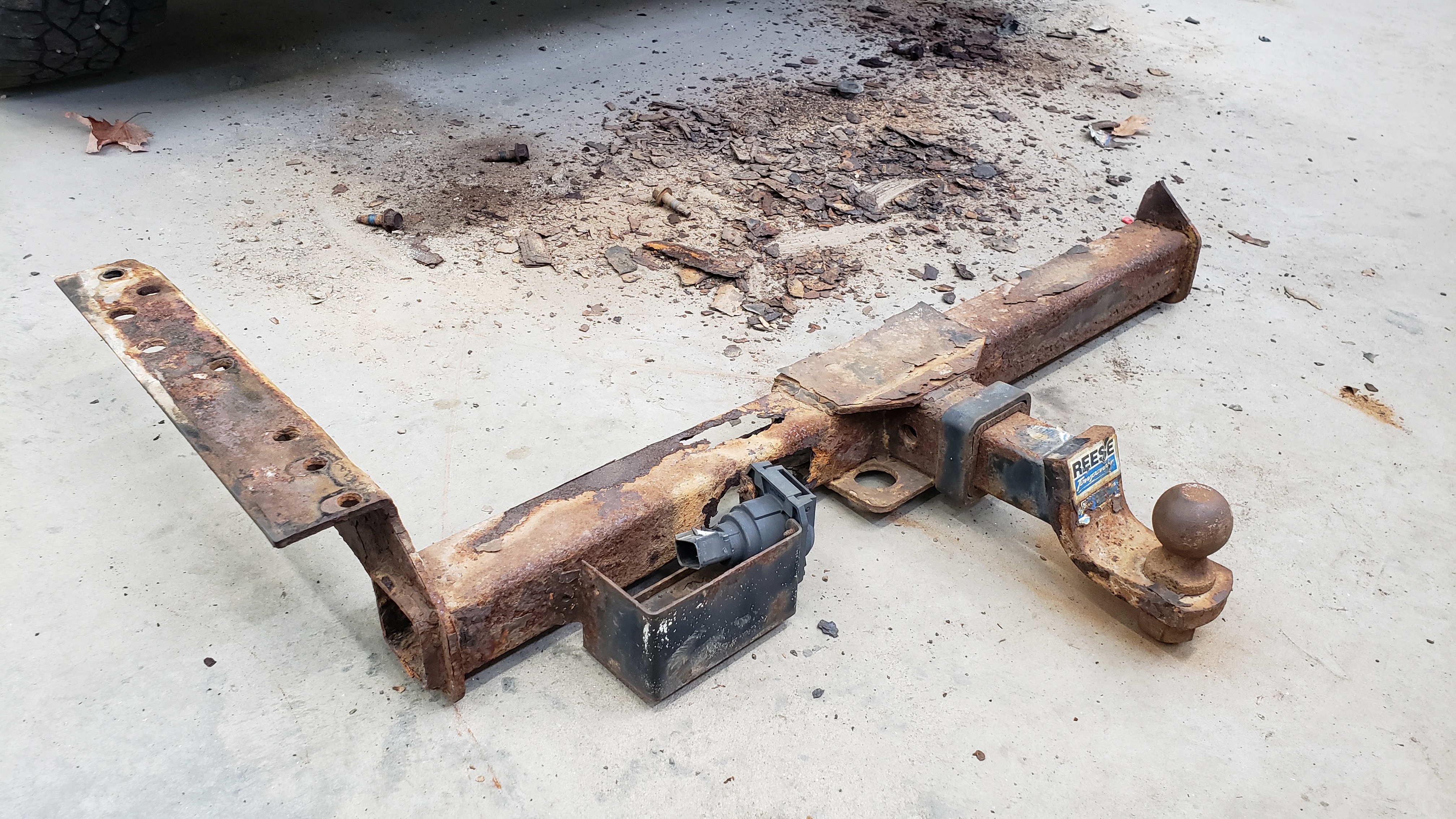 Those rust flakes on the floor were from me hammering away on the hitch trying to remove it. I failed. It probably wasn’t worth the effort to try to save the hitch since it’s so rusted but I figured it may be good to have a spare. Oh well.