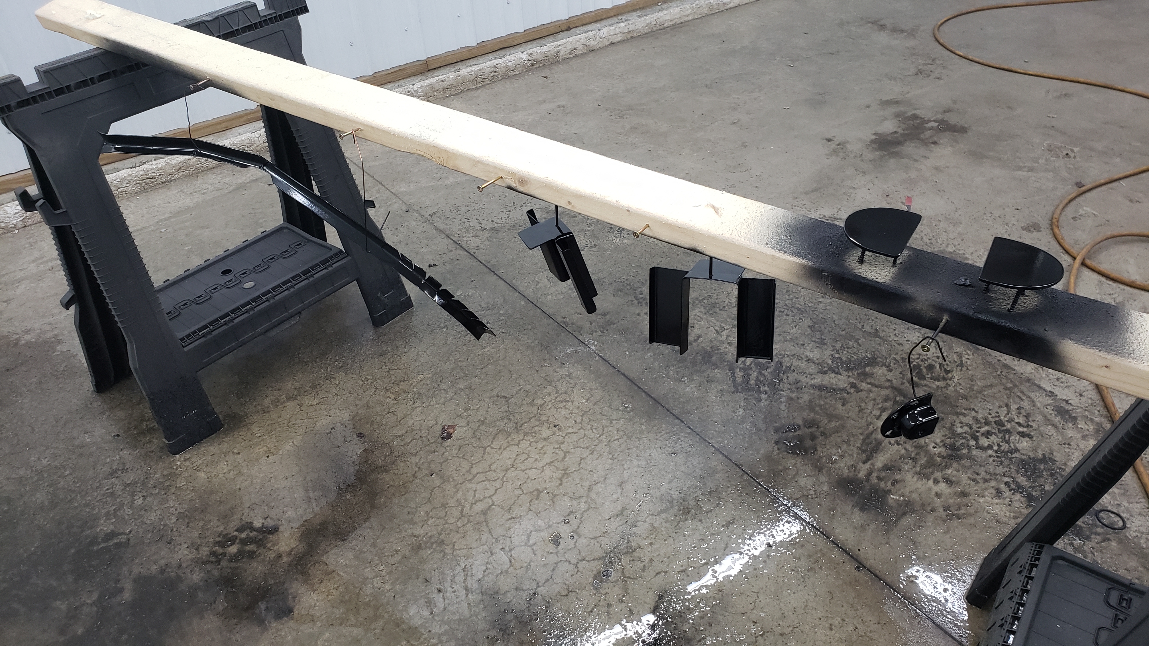 A day later a couple other custom brackets were sprayed. The long one on the left is the new wheel well lip for the floor, then the two small ones are for the frame rails to the rear crossmember, and the half circles are the seat pivot braces.