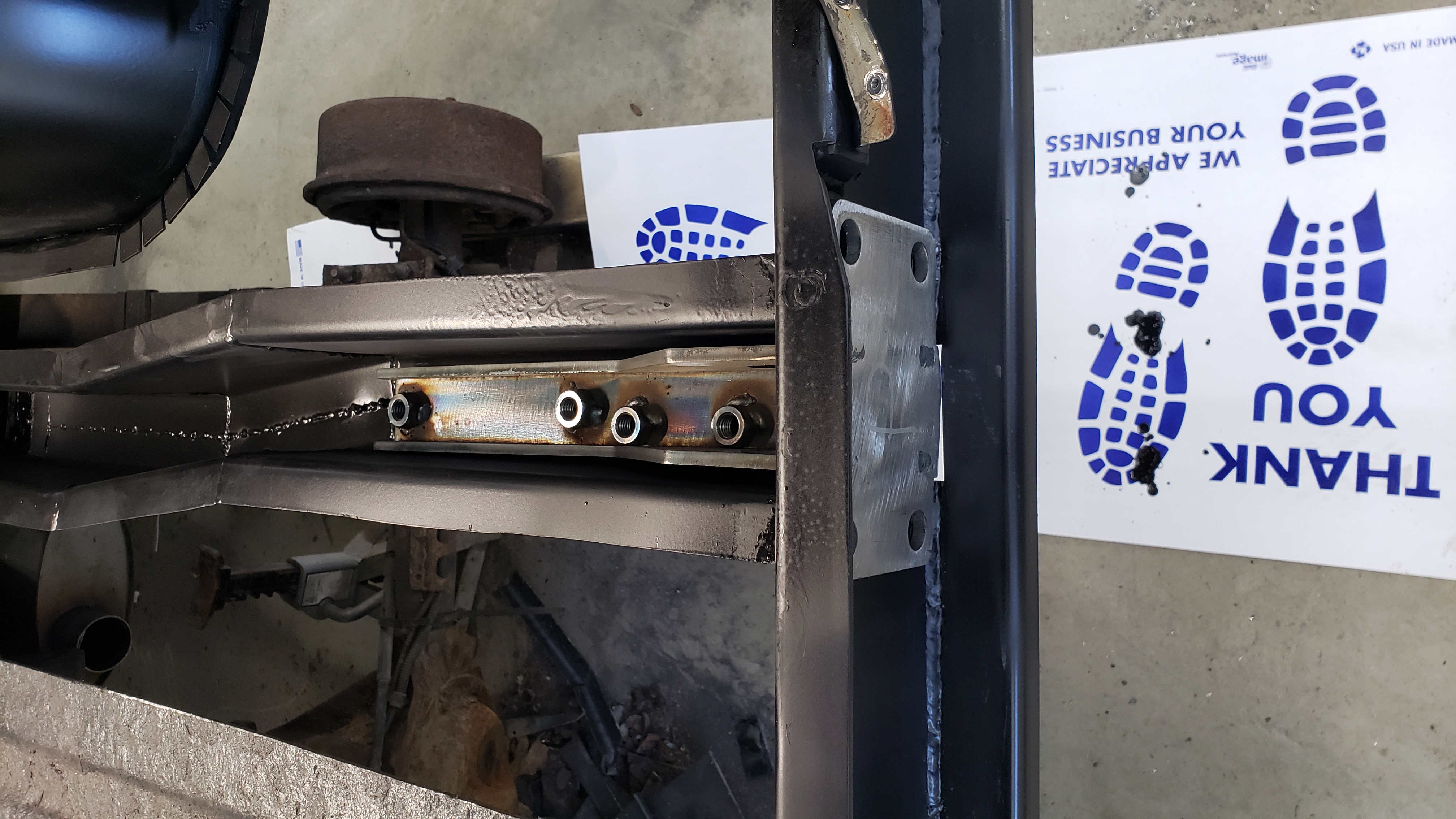 Remember those brackets that were painted up earlier on? This is what remains of one of them. When I designed the bracket that would mate the frame to the rear crossmember I forgot to see how it fitted with the shackle brackets. Turns out they got in the way so I had to use the angle grinder to change them last minute.
