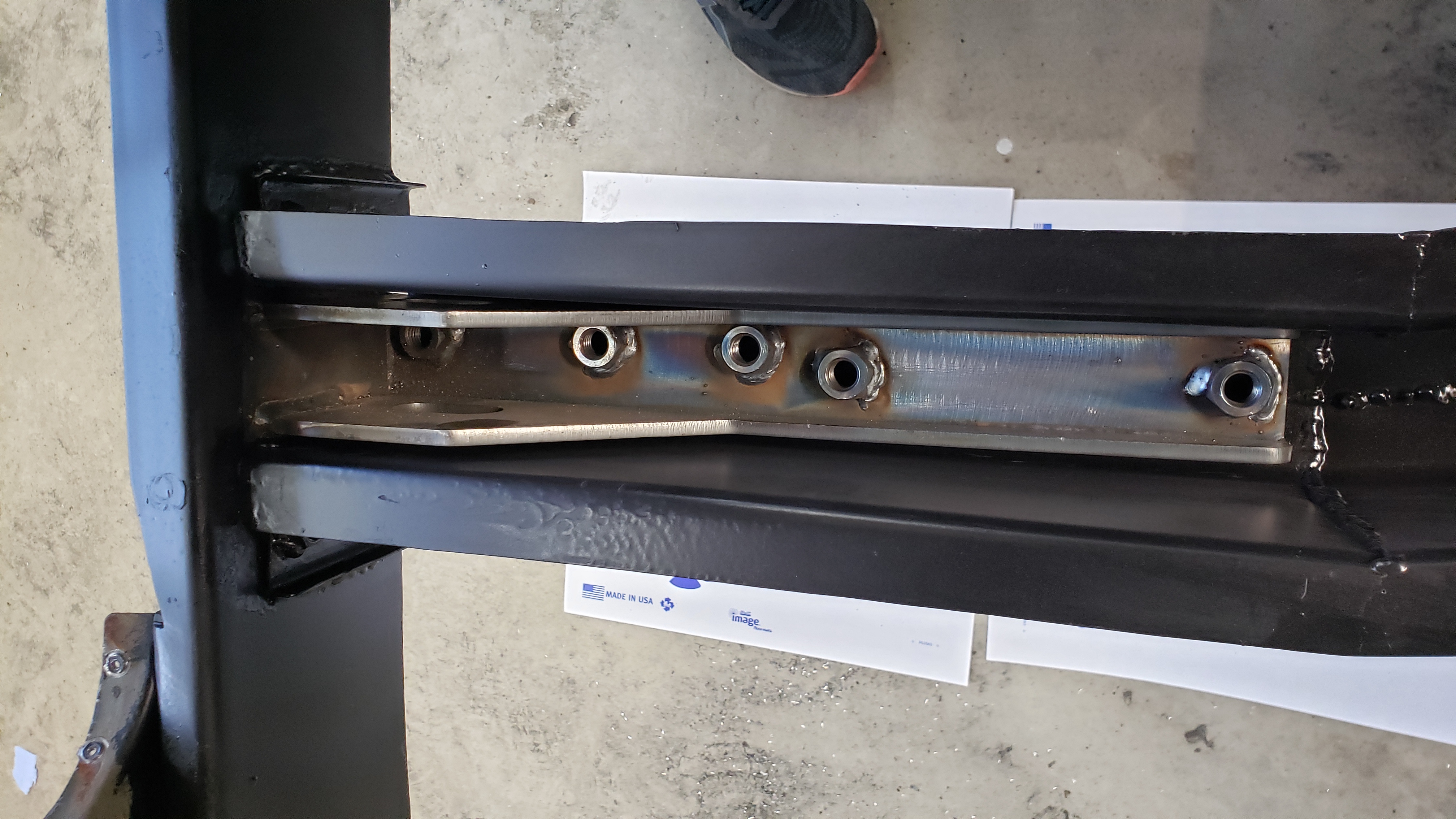 With everything painted up I finally welded in the frame rail. If you look close you’ll see nuts for the bumper mounts were welded in as well. The nuts are M10x1.5 flange nuts.