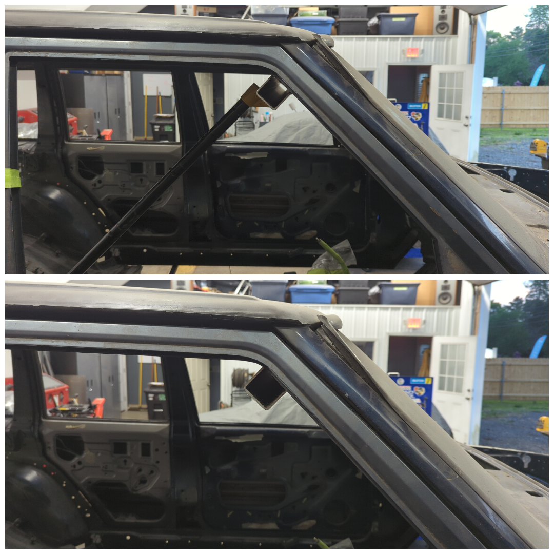 With the XJ sitting on the chassis table I felt it was time to address the windshield pillars not lining up with the front doors. The pillars are almost touching the top corner of each door because back when I was replacing the drip rails I didn’t brace the roof enough and it shifted.