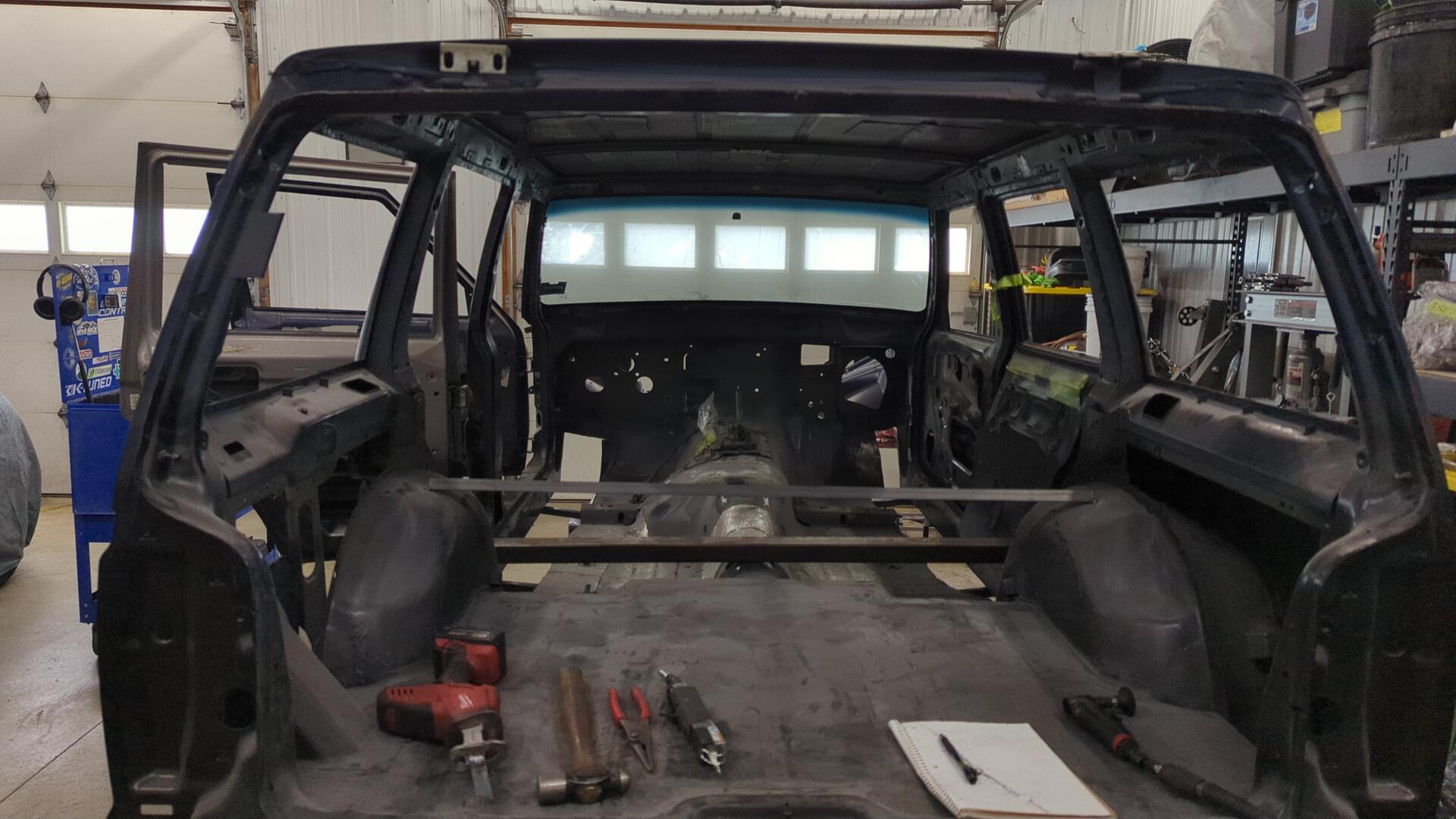 The lower tube ended up being a bad idea though as one of the door pinch welds started to crumple when I was pushing the driver side roof forward so I had to switch to angle welded on the floor above the frame.