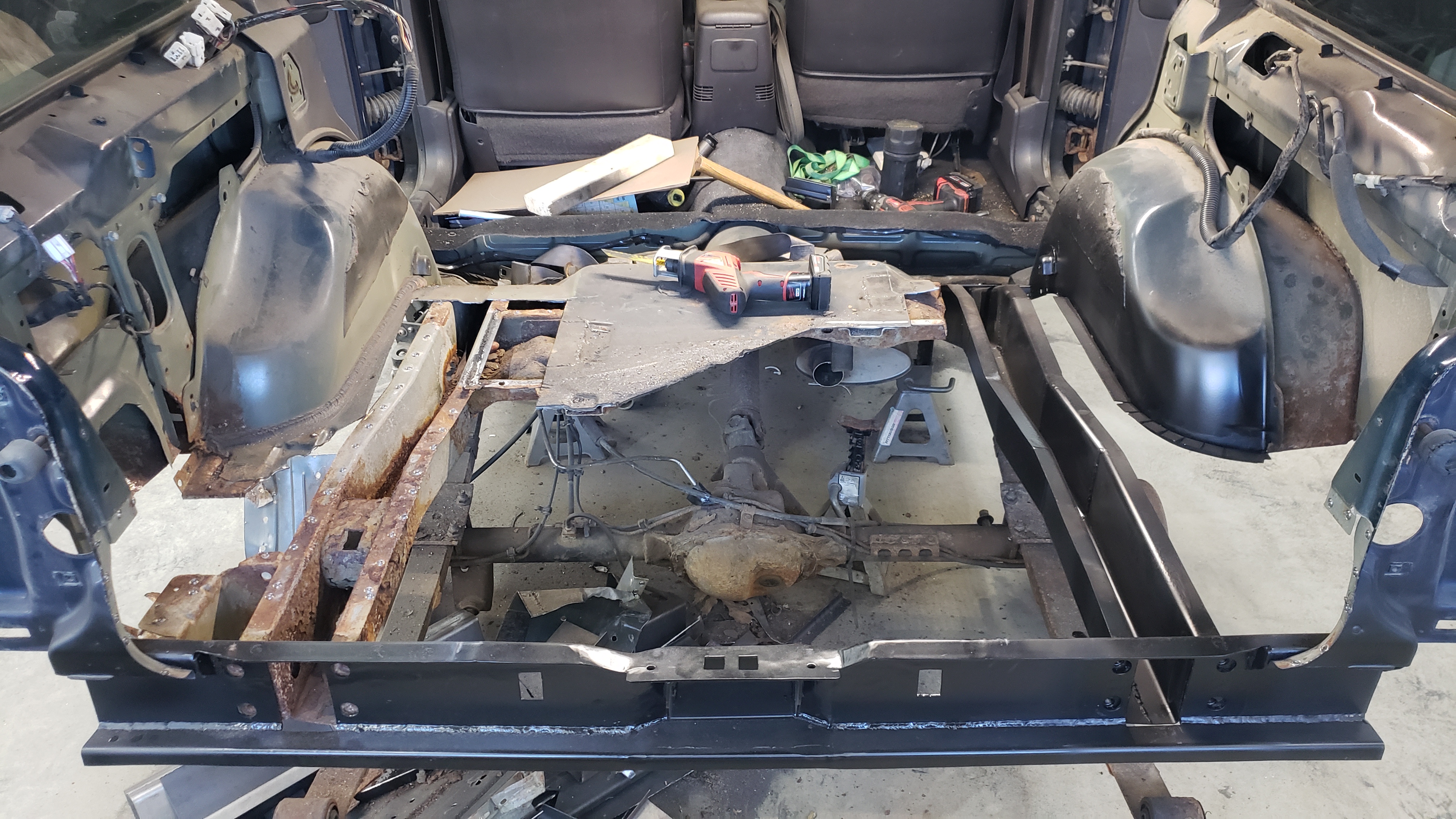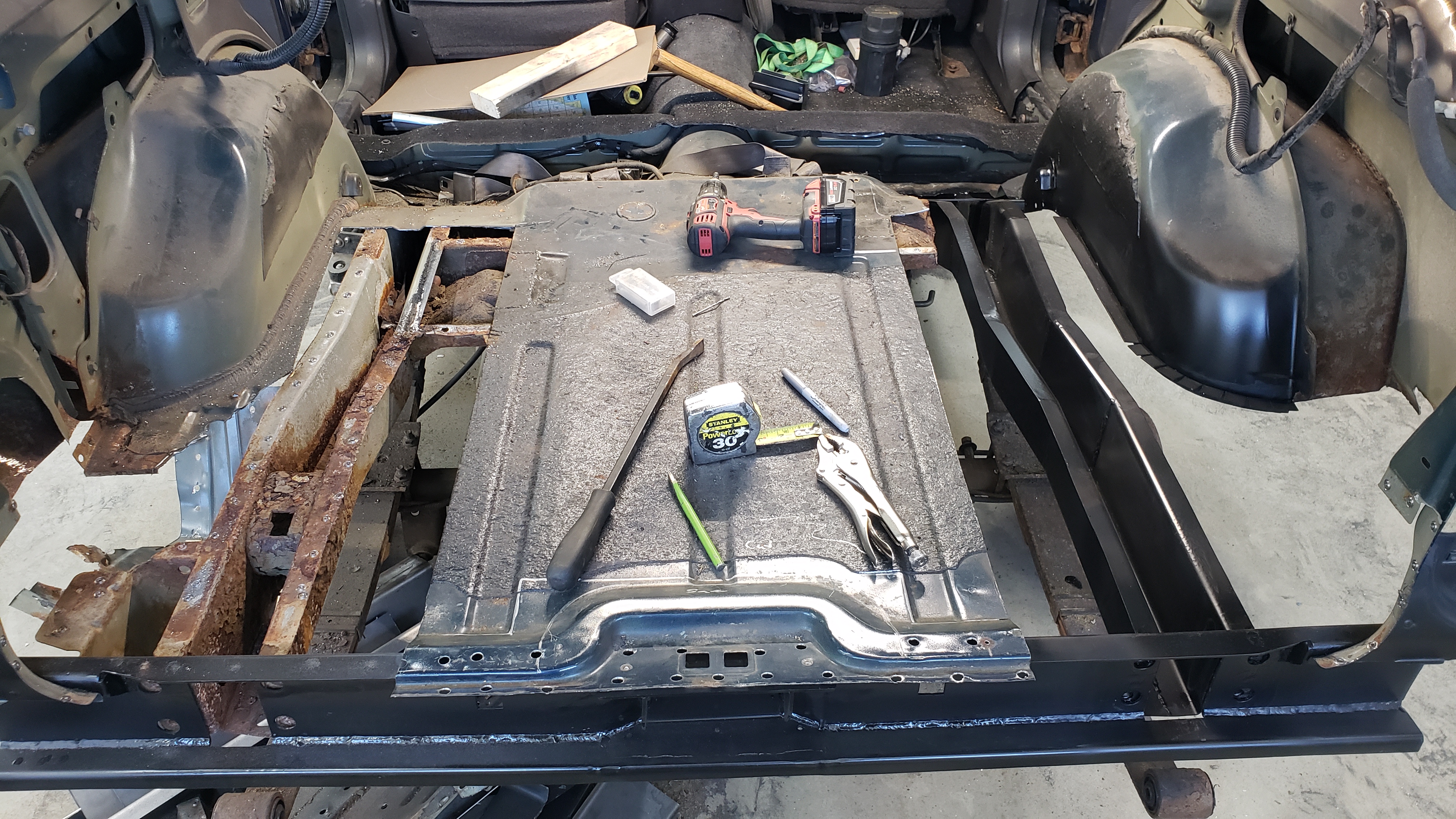 To prepare, I began by drilling out all of the spot welds holding the driver side frame rail in place, and then chopped out a good portion of the rear floor. This was surprisingly easy to do now that I knew where every spot weld was.