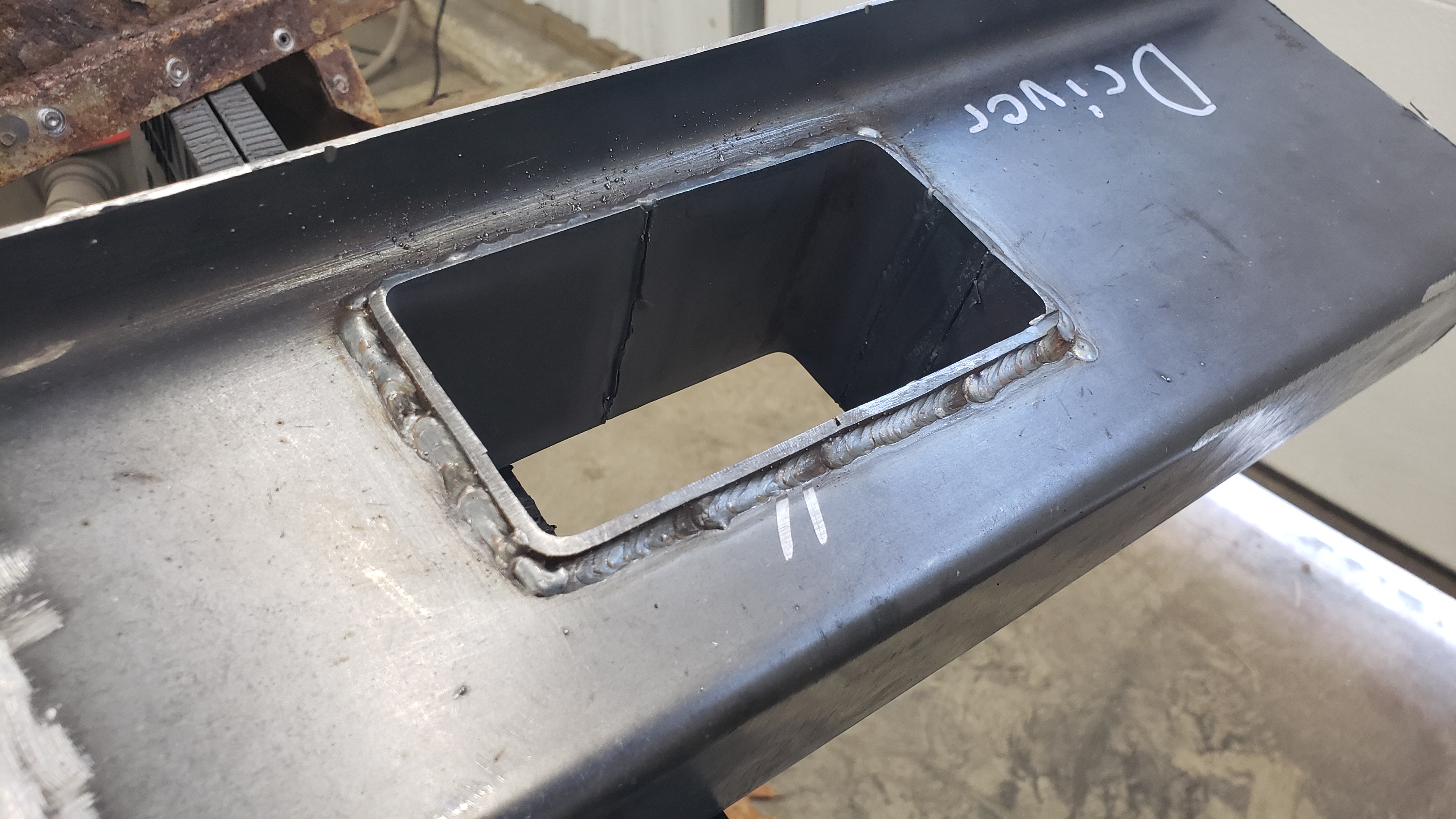 Then I added a hole for the gas neck to pass through. I made the hole from a 2x6 that I resized to 2 3/4"x5". It’s 1/8 thick and pretty damn solid. Size wise it matches up with the OEM one on the original frame rail. It only looks larger because the corners are less rounded.