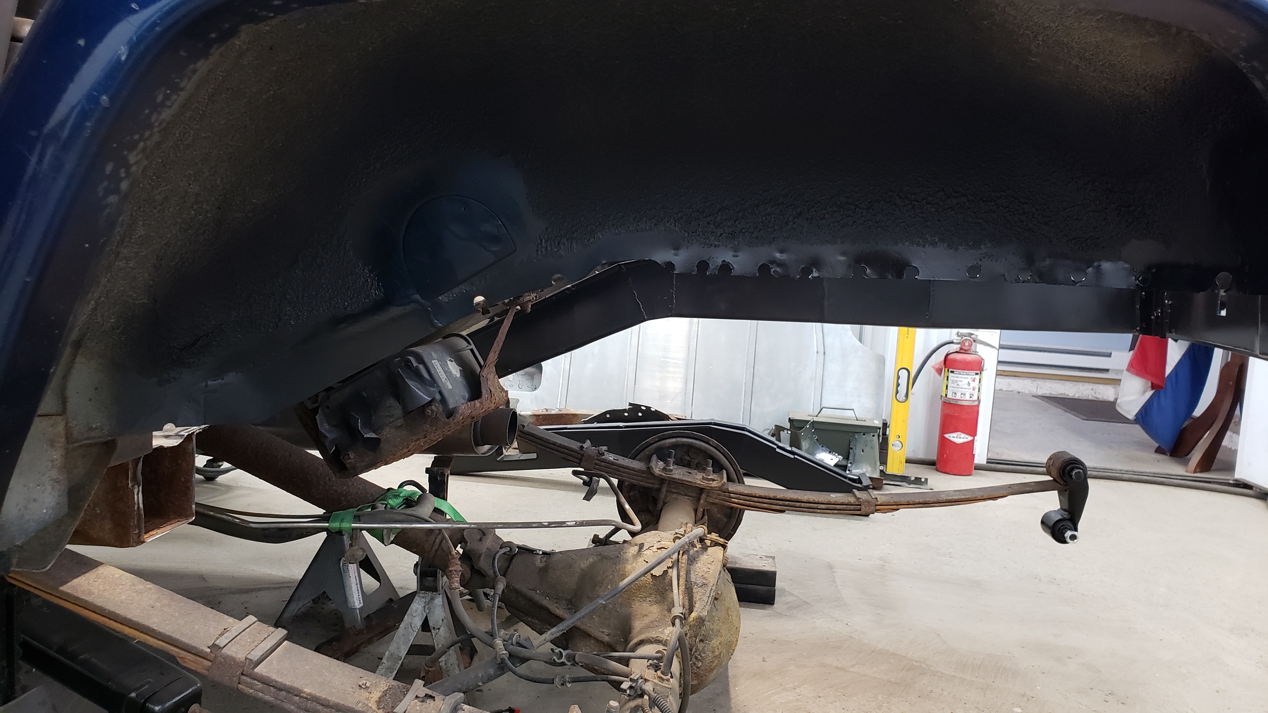 The half circle is the brace I made for the seat pivot bracket earlier on. To ensure no rust would form between the brace and the wheel well I poured paint down between them after spot welding it in place.At the same time as painting the wheel well I went ahead and sprayed up my frame tie in brackets and no lift shackle brackets.