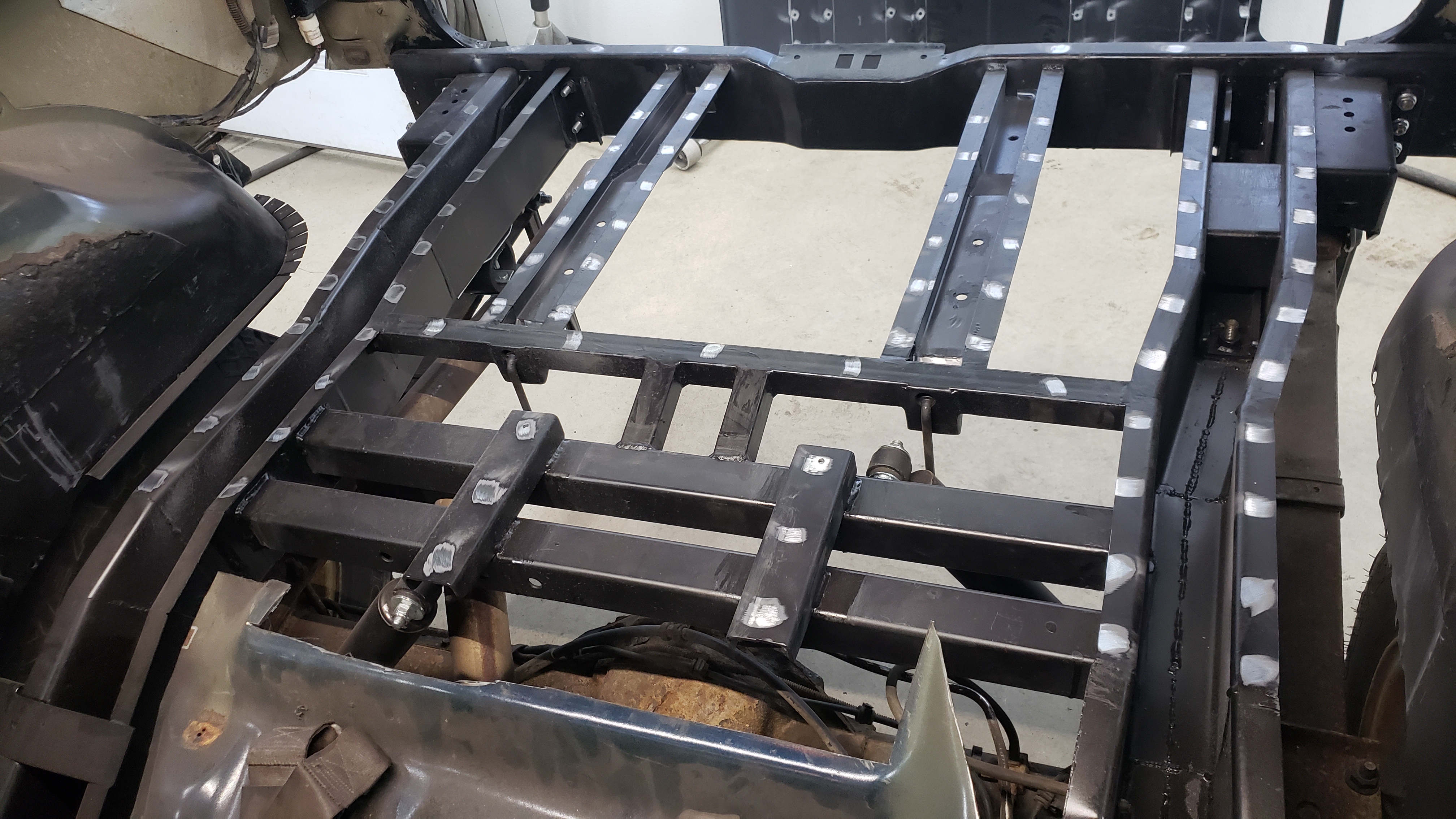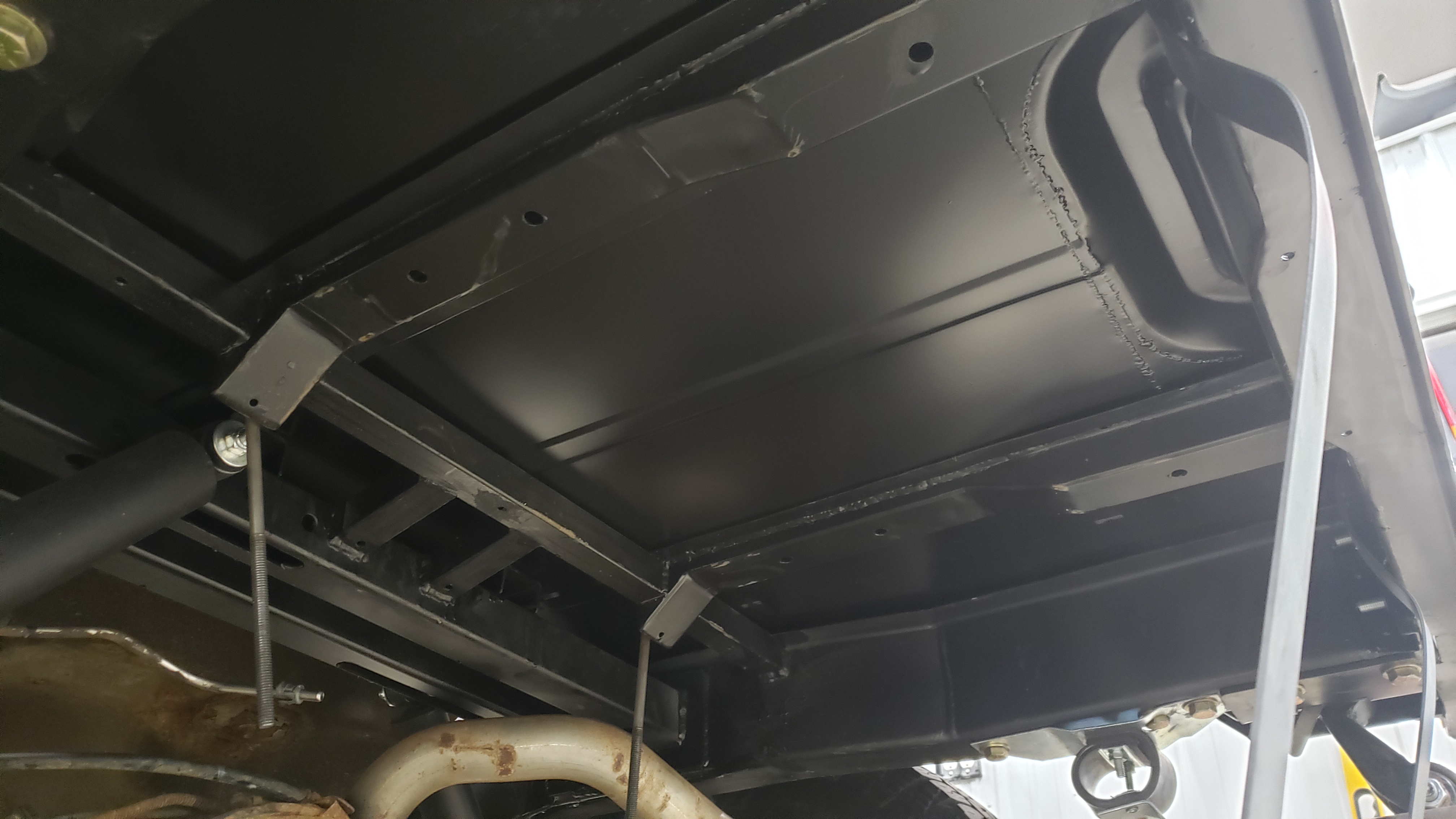 Atop my rear crossmember I had to add two little braces to support the floor. The original crossmember sits flush up against the floor with a bunch of tack welds but mine sits about 1" below. The two braces are just a way to compensate.
