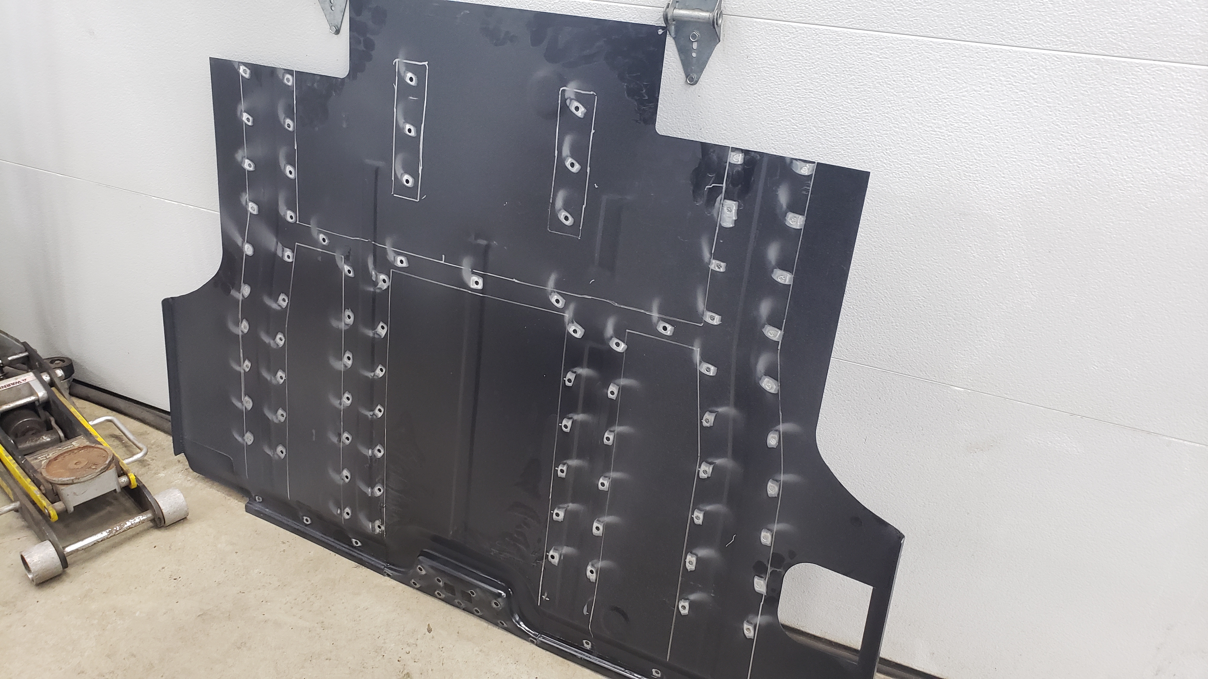 I used a silver sharpie to draw outlines of every piece that touches the floor on the underside. This way I’d have a good reference of where my spot welds should be when I drill them with the floor removed from the vehicle.