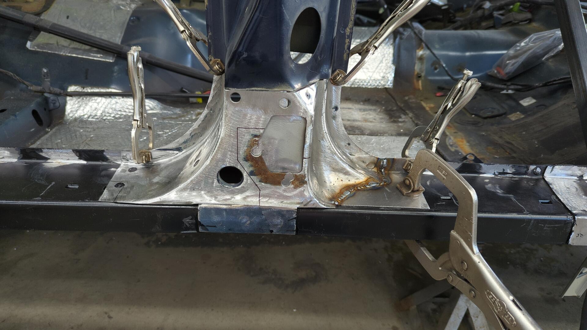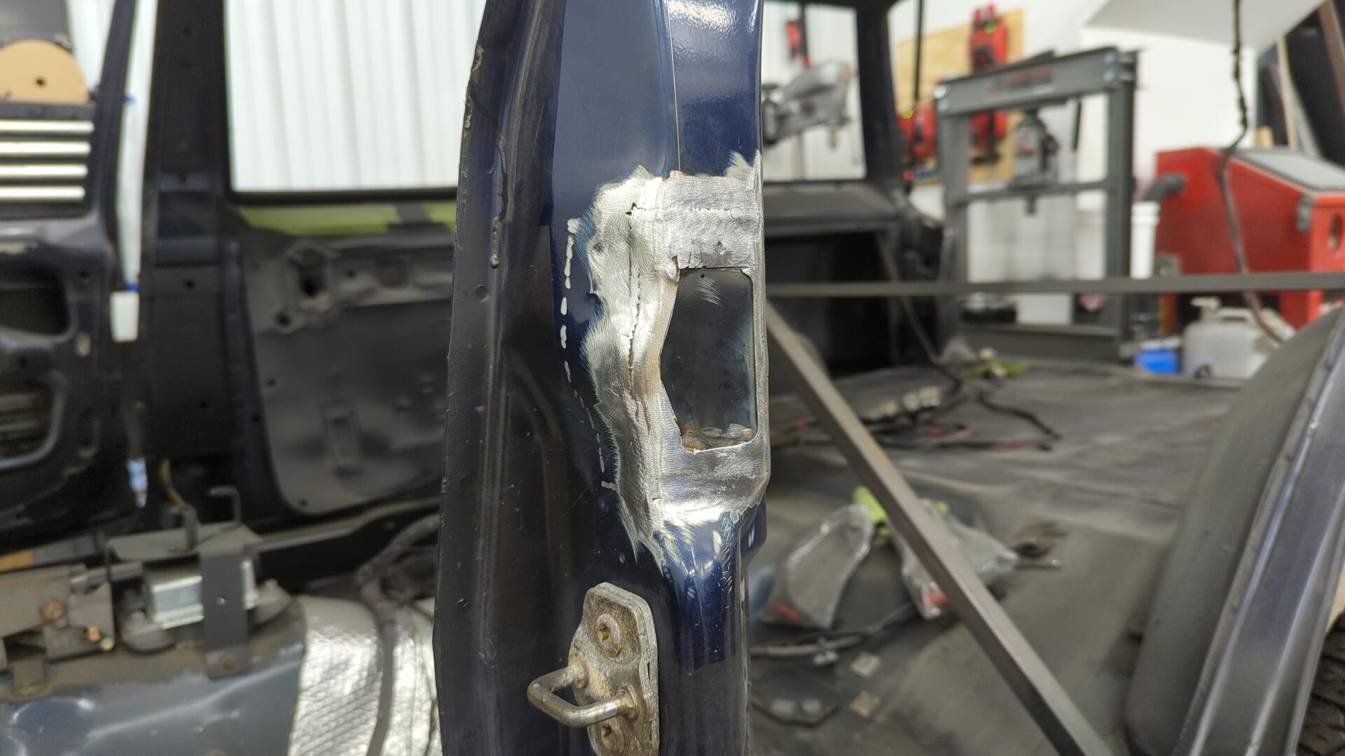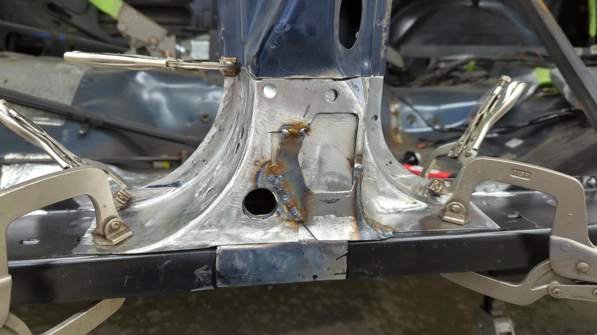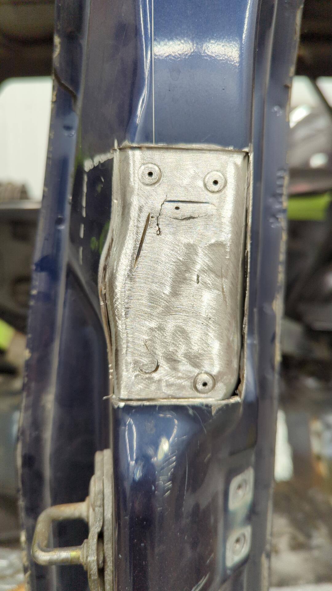 Ready to weld. (Also welded an extension onto the inner layer of the B pillar since it was missing.)