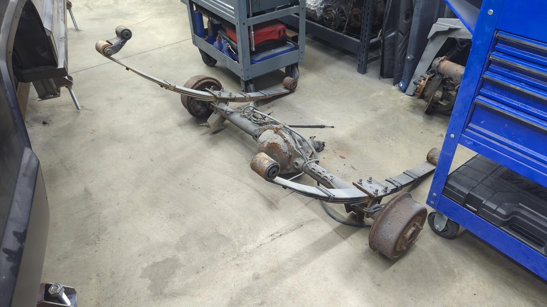 Once the XJ was pulled far enough up on the table I started removing the rear leaf springs and axle.