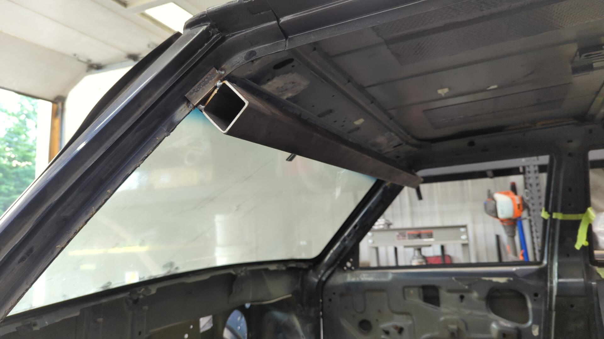 To ensure I had a safe pushing point at the top of the windshield pillars for my portapower I tack welded a tube into place.