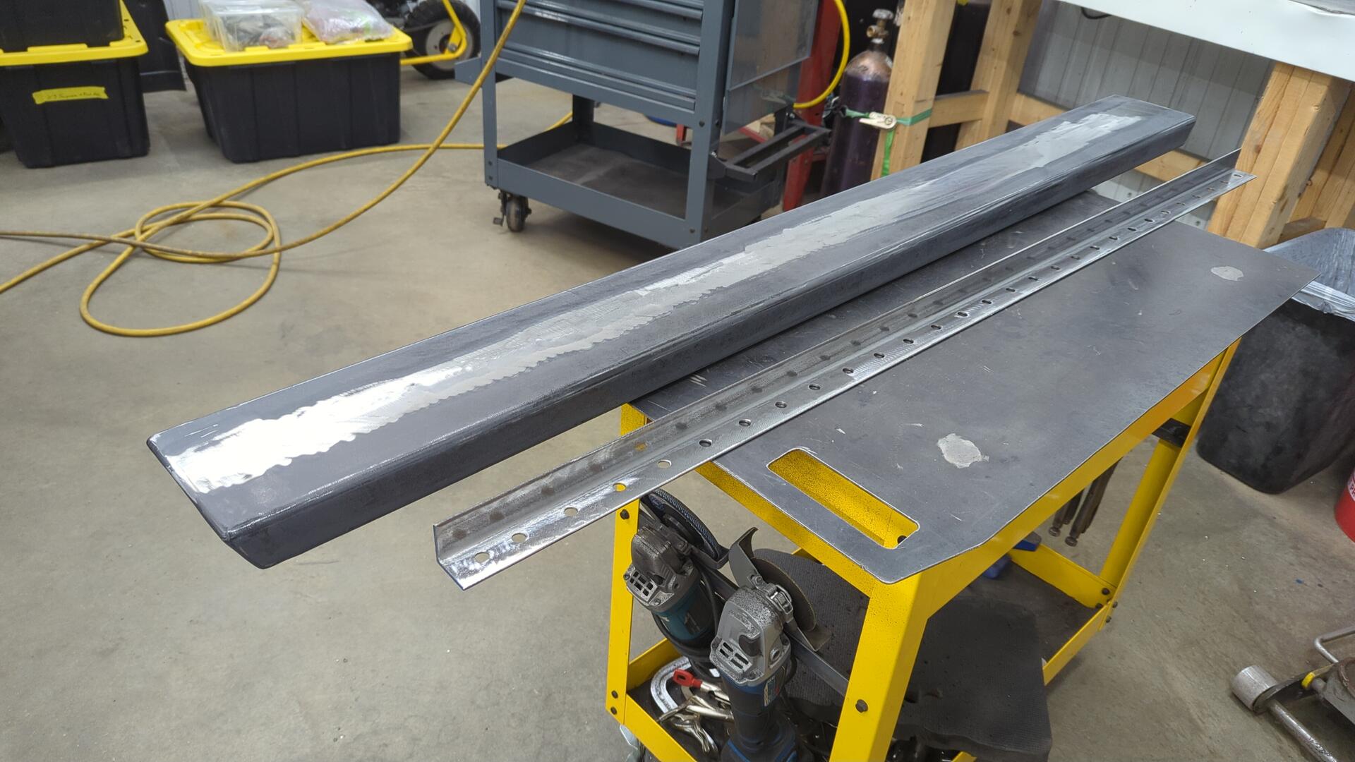 With the test fit looking good I started prepping the 2x6 for welding my custom upper bracket to it. The upper bracket is nothing fancy because it’s just 1/8" thick angle that I drilled a ton of holes in for plug welds.