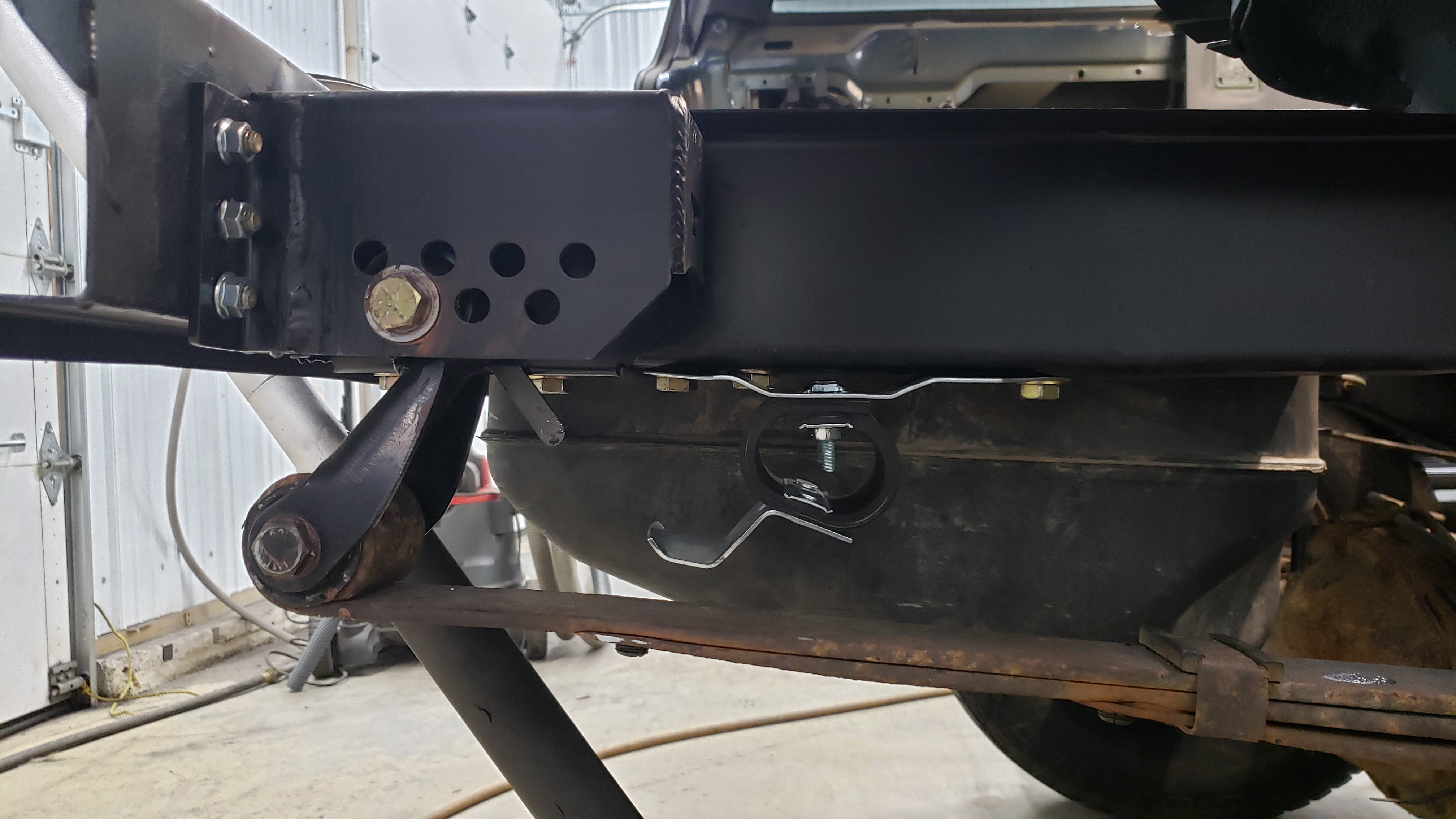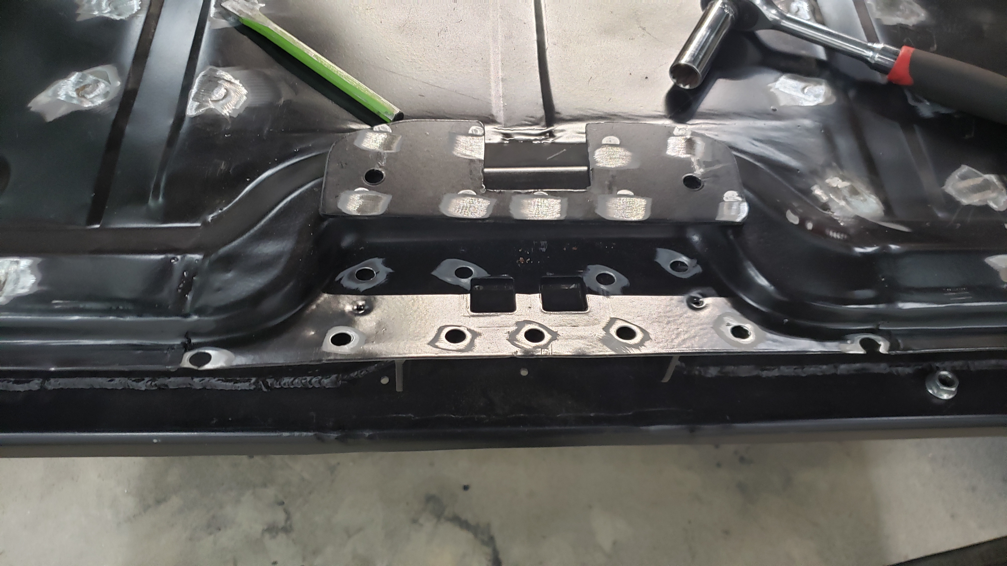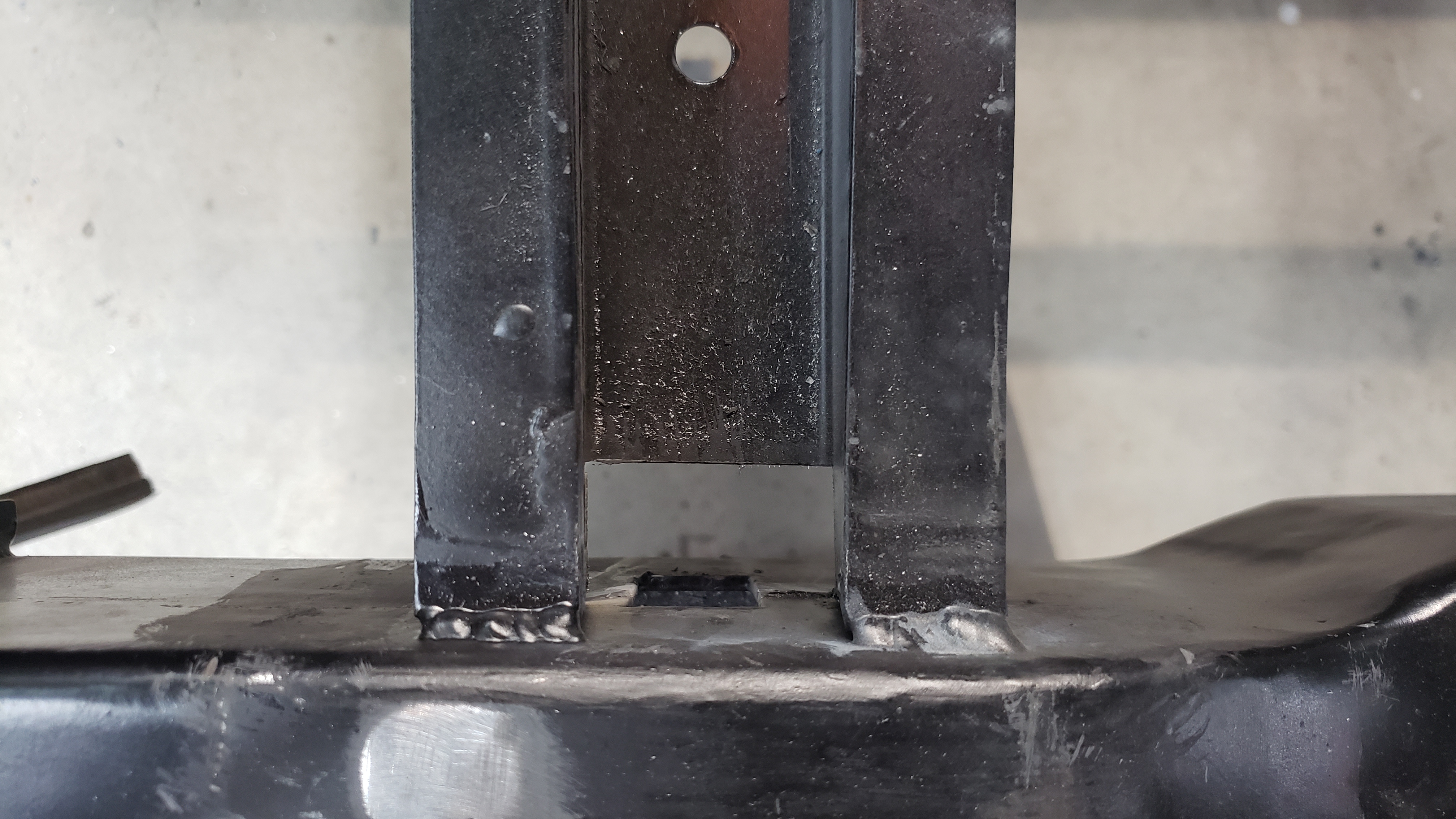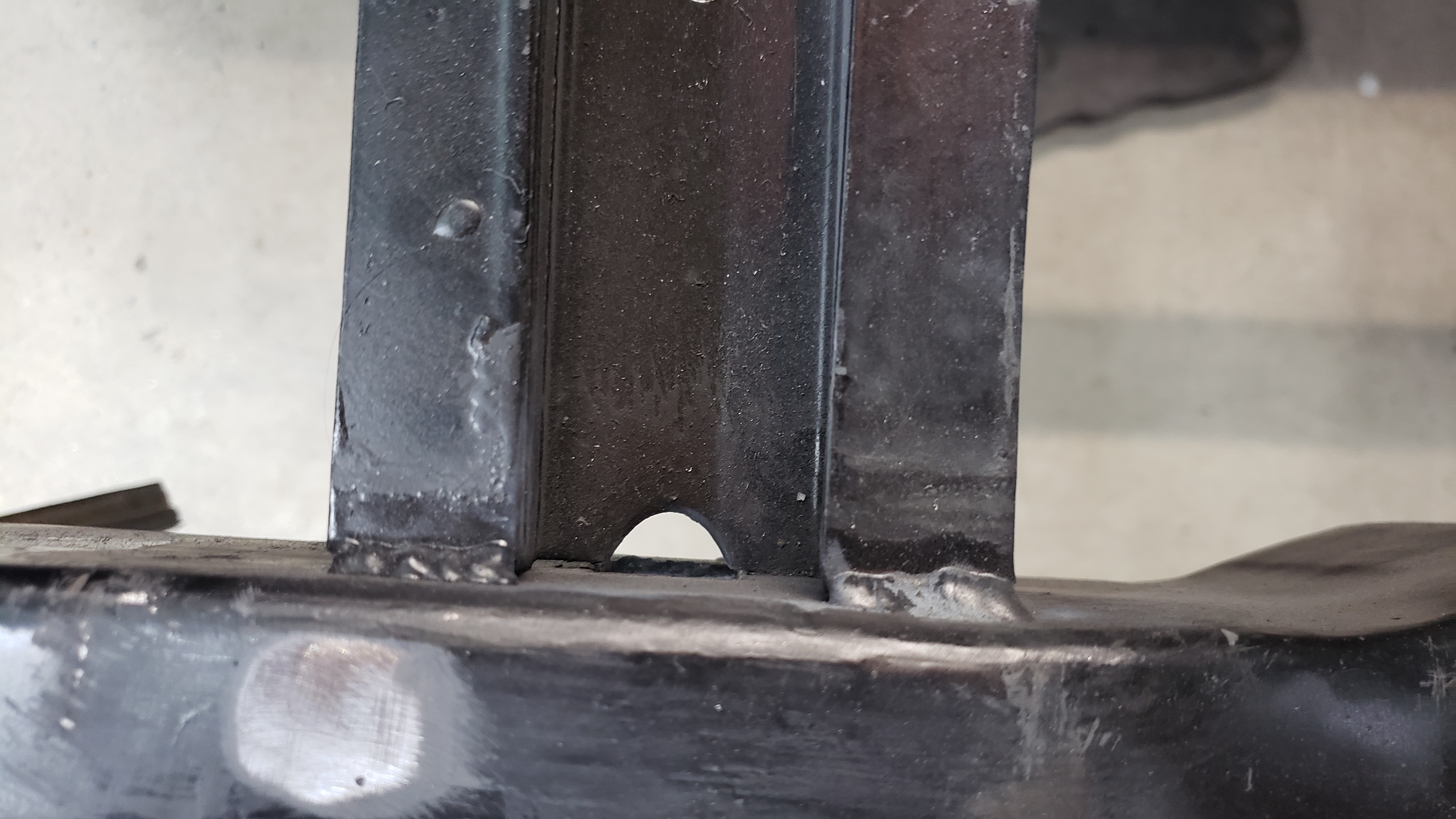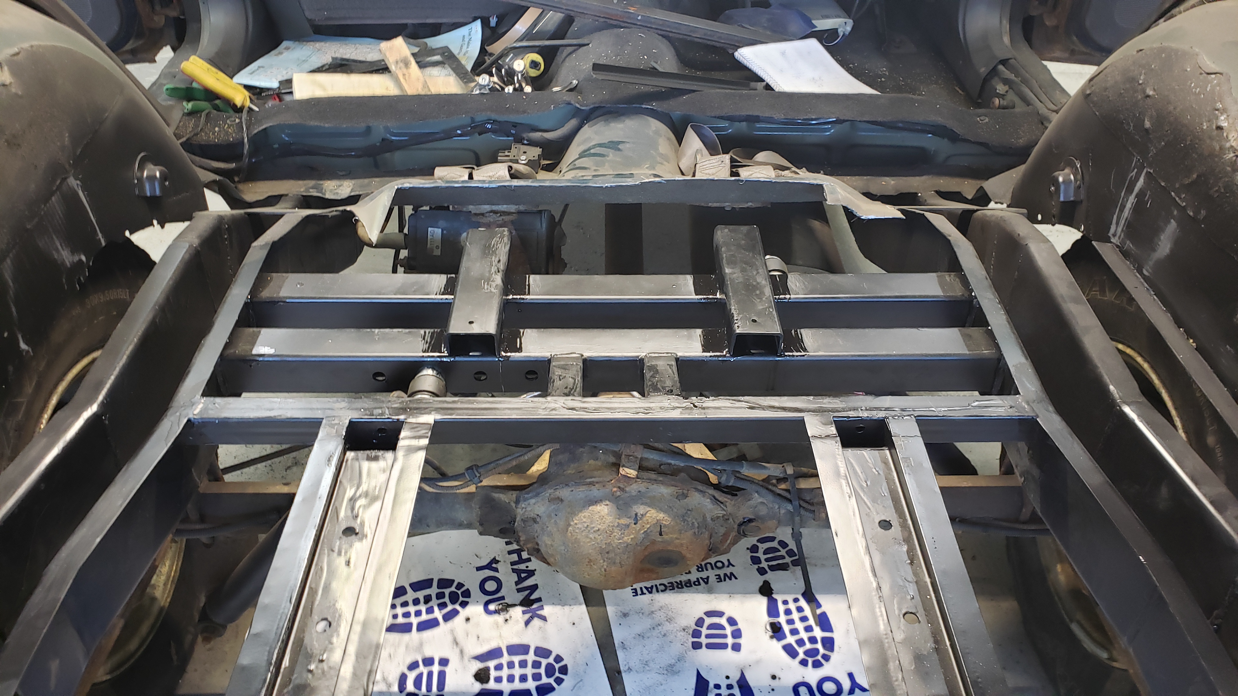 Atop my rear crossmember I had to add two little braces to support the floor. The original crossmember sits flush up against the floor with a bunch of tack welds but mine sits about 1" below. The two braces are just a way to compensate.